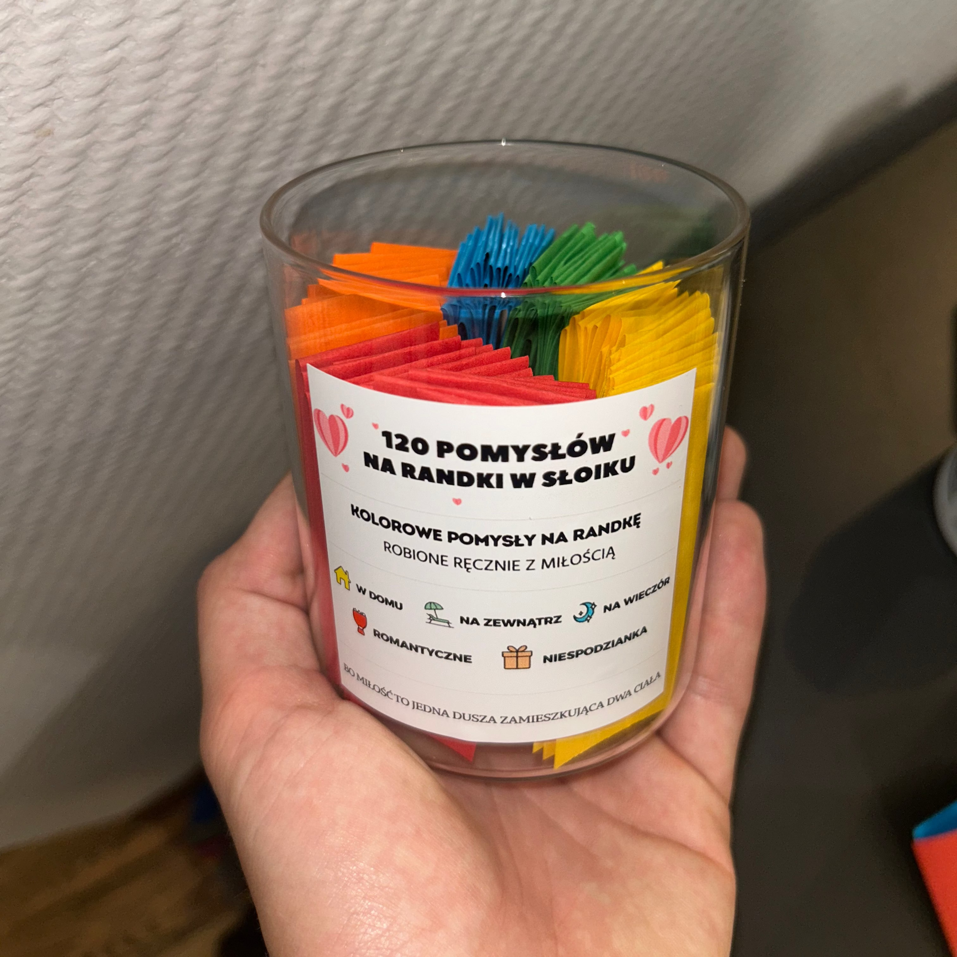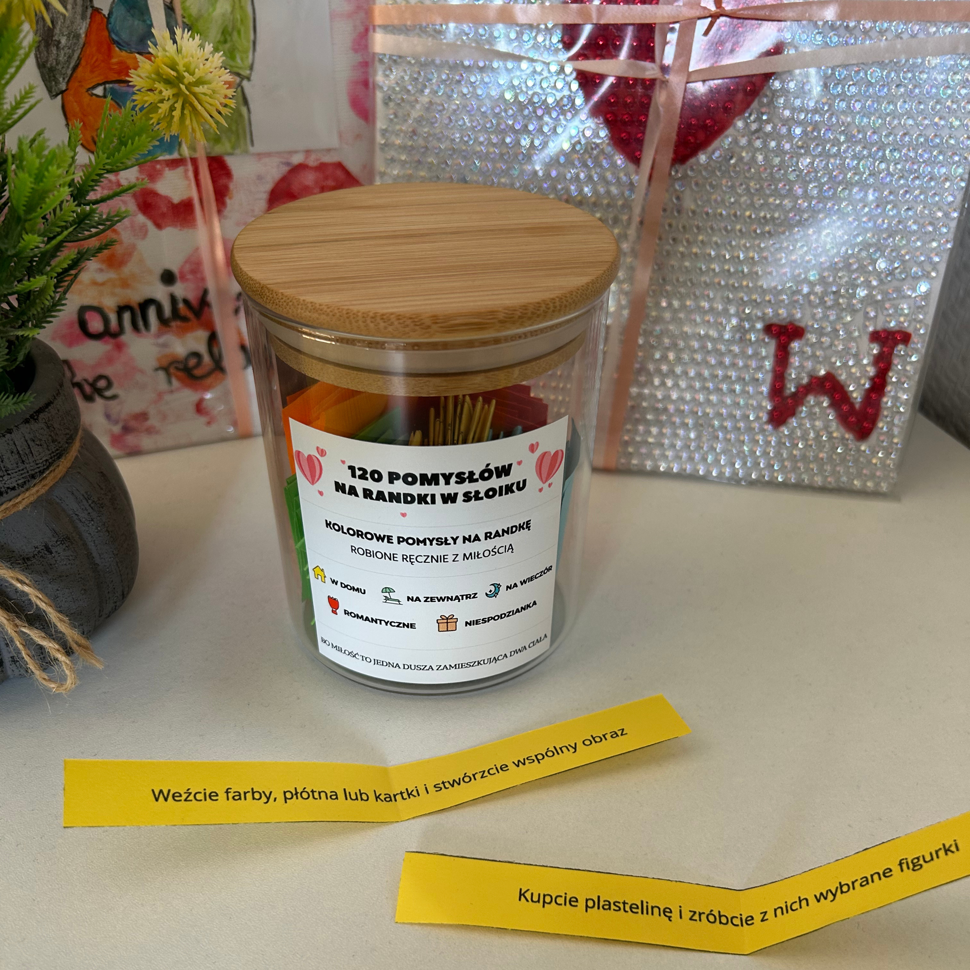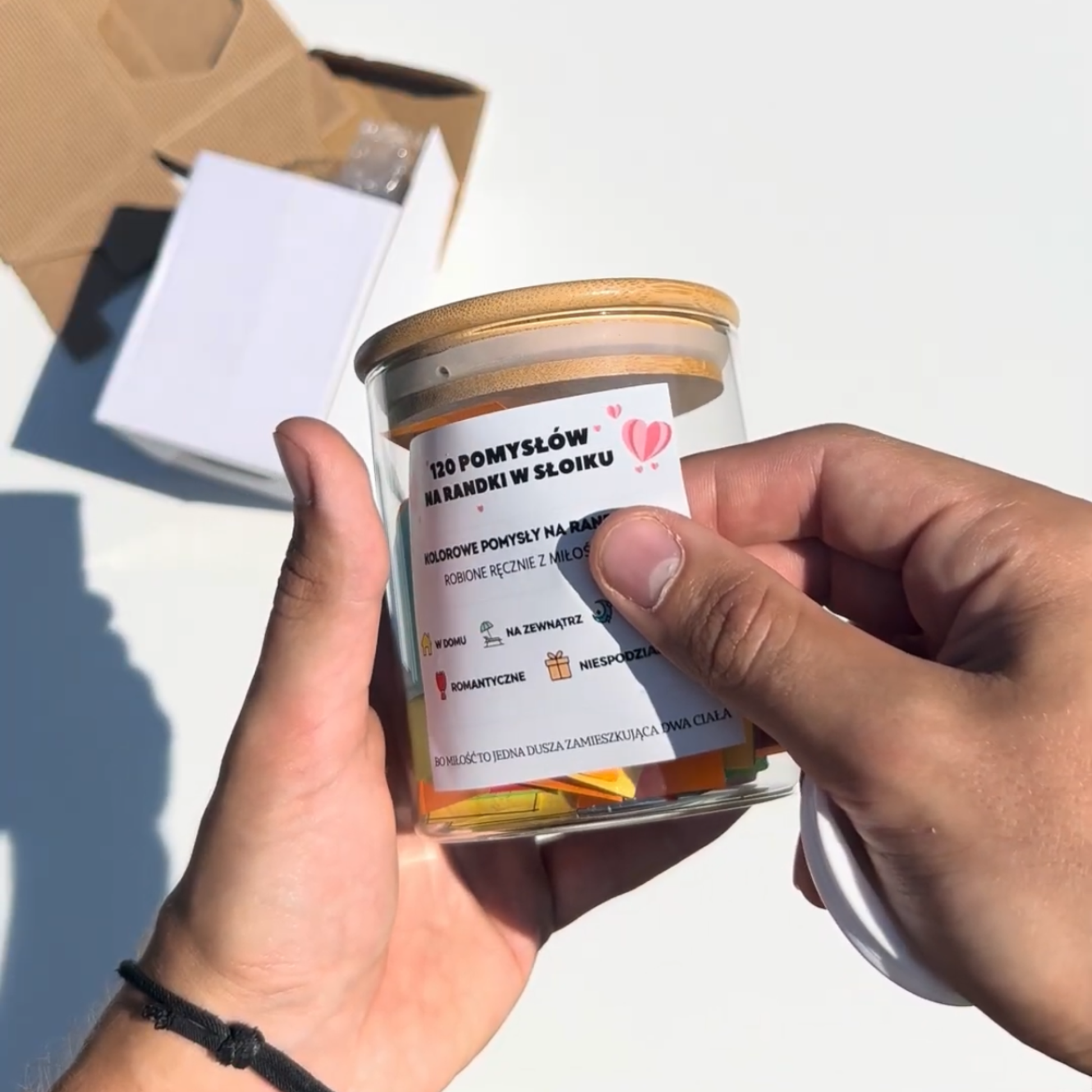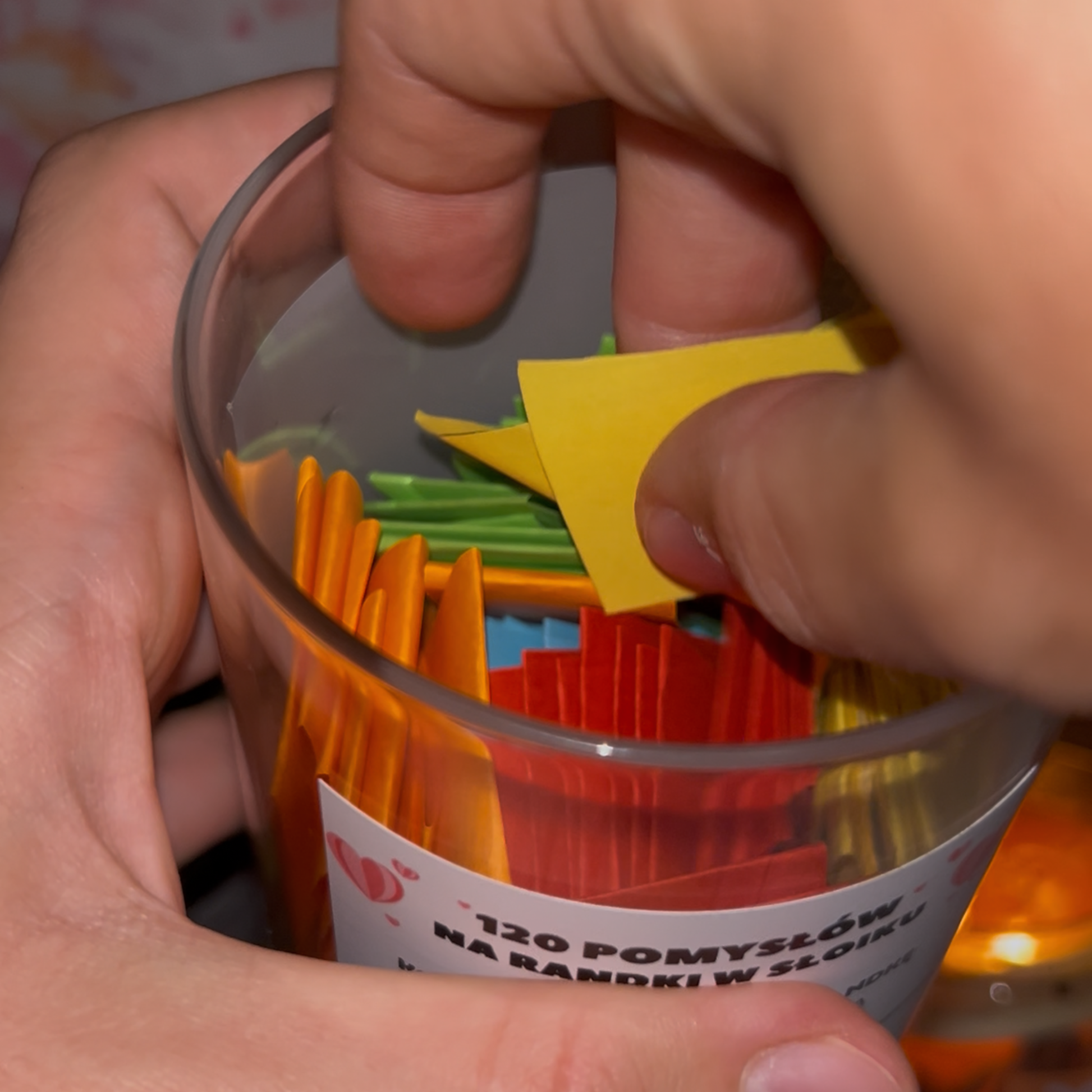W środku znajdziecie 120 karteczek z pomysłami na randki, podzielonych na kolory: